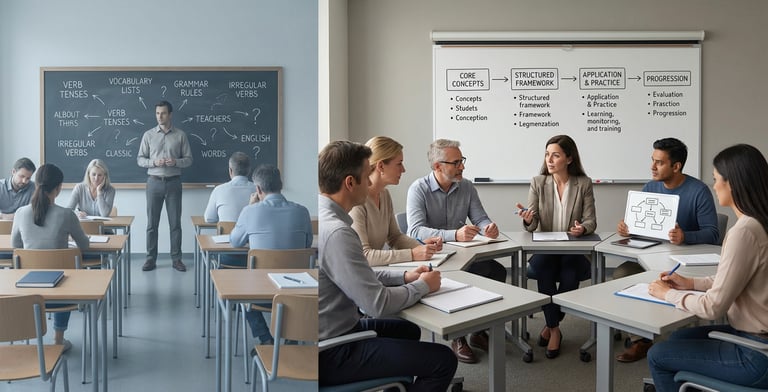 O resultado é conhecido: avanço irregular, dependência constante do professor e dificuldade de transferir o que foi aprendido para situações reais de uso.